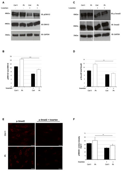 Emerging evidence indicates that losartan, an inhibitor of angiotensin-II type 1 receptor, is capable of reducing fibrosis in vivo and in vitro [34] by reducing the canonical and non-canonical TGF-β pathway activation status [35,36,37]. Based on these experimental data, we hypothesized that losartan could be used to decrease the TGF-β signaling hyperactivation observed in patient’s fibroblasts and consequently attenuate its fibrotic profile. In order to test our hypothesis, we monitored the TGF-β signaling status by evaluating the levels of p-ERK1/2 and p-Smad2 in our patient’s cells treated with losartan. Immunoblotting analysis revealed a significant reduction of endogenous p-ERK1/2 and p-Smad2 in treated cells, compared to untreated fibroblasts (Figure 5A–D). Finally, to support these data, we quantified the nuclear localization of p-Smad2 in treated and untreated patient’s cells by confocal analysis. The nuclear p-Smad2 signal resulted reduced in treated cells with respect to untreated cells (Figure 5E,F). Taken together, these data suggest that the losartan induces the reduction of the TGF-β signaling pathways’ activation status in the patient’s fibroblasts.