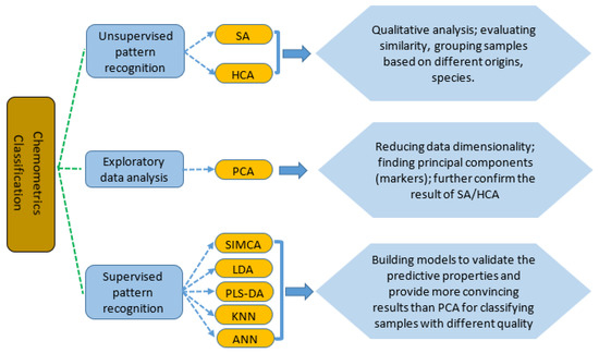 The chemometrics techniques widely applied for the classification of objects. SA = similarity analysis, HCA = hierarchical clustering analysis, PCA = principal component analysis, SIMCA = soft independent modeling of class analogy, LDA = linear discriminant analysis, PLS-DA = partial least squares discriminant analysis, KNN = k-nearest neighbors, and ANN = artificial neural networks [30].