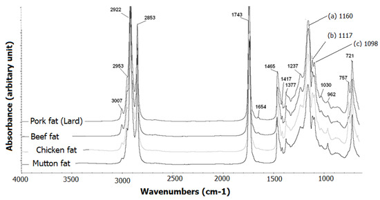 For quantitative analysis, FTIR spectroscopy combined with chemometrics of partial least square regression (PLSR) has been successfully used for the simultaneous analysis of lard in the quaternary mixtures with chicken fat, mutton fat, and beef fat [48]. Figure 3 shows the FTIR normal/original spectra of these animal fats. These FTIR spectra look similar and revealed typical characteristic of absorption bands of triacylglycerols. The peak at 3007 cm−1 corresponds to the stretching of vinylic C-H. The stretching vibrations of methylene (-CH2-) and methyl (-CH3) groups can be seen at frequencies of 2922 and 2853 cm−1, respectively. Methylene and methyl groups are also observed at 1465 and 1377 cm−1 due to their bending vibrations. The carbonyl (C=O) absorption of ester linkage is observed at 1743 cm−1 with strong intensity. The bands at 1237, 1160, 1117, 1098, and 721 cm−1 are the results from the overlapping of the CH2-rocking vibrations and the out-of-plane bending vibration of cis-disubstituted olefins. However, using detailed investigation, the peak intensities of lard could be differentiated from others, especially in peaks 1160 (a), 1117 (b), and 1098 cm−1 (c).