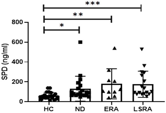 Comparison of SPD serum levels between ACPA-positive subjects and healthy controls. *: p < 0.05; **: p < 0.005; ***: p < 0.0005. Abbreviations: SPD, surfactant protein D; HC, healthy controls; ND, no disease subjects; ERA, early rheumatoid arthritis patients; LSRA, long standing rheumatoid arthritis patients.