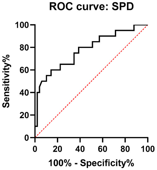 In order to evaluate the diagnostic performance of SPD serum levels with regard to the detection of HRCT abnormalities, ROC analysis was performed (Figure 3). The AUC value was 0.77 (95% CI: 0.65–0.9). The optimal cut-off point of diagnostic performance was 90.78 ng/mL, with a sensitivity of 80% and a specificity of 62% for HRCT abnormalities detection.