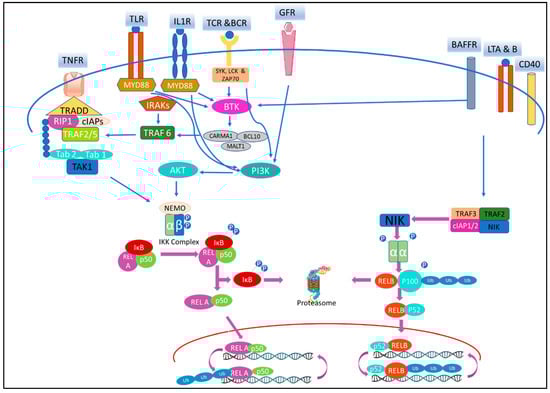Schematic diagram of the canonical and non-canonical Nuclear factor kappa B (NF-κB) signaling pathways. Canonical NF-κB signaling cascade is initiated at the cell membrane through tumor necrosis factor –α receptor (TNFR), interleukin1 receptor (IL1R), toll-like receptor (TLR), T-cell receptors (TCR), B-cell receptors (BCR), and growth factor receptors (GFR) while the non-canonical pathway can be stimulated via receptors such as lymphotoxin α and β (LTA and B), cluster of differentiation 40 (CD40) and B-cell activating factor (BAFF). Upon stimulation of the receptor, the canonical pathway is mediated through adapter proteins and kinases that eventually activate the IκB kinase (IKK) complex via activation of transforming growth factor β-activated kinase 1 (TAK1). Similarly, PI3K mediates signaling from GFR, TLRs, TCR, BCR, and cytokines feeds into activation of IKK via phosphorylation of AKT (protein kinase B) and IKKα. Subsequently, polyubiquitination and site-specific phosphorylation of IκB protein via IKK complex leads to its proteasomal degradation. The released NF-κB dimers translocate to the nucleus. Meanwhile, during the activation of the non-canonical pathway, TNF receptor-associated factor (TRAF) and cellular inhibitor of apoptosis (c-IAP) are recruited to the receptor as TRAF2/TRAF3/c-IAP1/2 complex. TRAF2/TRAF3 undergo proteasomal degradation allowing NF-κB-inducing kinase (NIK) levels to be stabilized. NIK then phosphorylates IKKα homodimer. Activated IKKα homodimer phosphorylates p100, leading to the partial degradation of p100 to p52. RelB/p52 heterodimers translocate to nucleus for further transcription.
