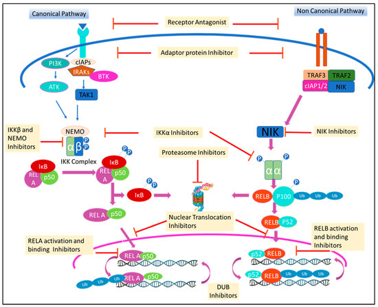 The NF-κB pathway can be triggered by diverse stimuli that includes inflammatory cytokines, immune signals and antigens, microbial products and stress signals []. Upon stimulation, either the canonical or the non-canonical pathway (Figure 1) is activated, depending on the type of Inhibitor of κB (IκB) protein or IκB kinase (IKK) complex involved. The biology of this signaling cascade is well reviewed in the literature [,]. On stimulation of the receptor, canonical pathway mediated through adapter proteins and kinases, activates IKK complex that comprises of IKKα/β/γ. Polyubiquitination and site-specific phosphorylation subsequently lead to proteasomal degradation of IκB protein and release of NF-κB dimers for translocation to the nucleus. Furthermore, the pathway mediated by NF-κB1/p50, also involves partial degradation of p105 to p50. Non-canonical pathway [,], on stimulation recruit tumor necrosis factor (TNF) receptor-associated factor (TRAF) and cellular inhibitor of apoptosis (c-IAP) as TRAF2/TRAF3/c-IAP1/2 complex. NF-κB-inducing kinase (NIK), that is constitutively bound to the complex, on activation dissociates, gets stabilized and phosphorylate IKKα homodimer. This leads to partial degradation of p100 to p52 and the RelB/p52 heterodimer translocate to nucleus for further transcription [].