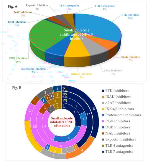 Nuclear factor kappa B (NF-κB) signaling has been well studied for more than three decades from the first report by Sen et al. [] in 1986. It is implicated in both normal physiology [,] and in the development of a multitude of diseases [] ranging from inflammation [,], cancer [,,] to autoimmune disorders [,]. Thus, it is not surprising that many researcher groups are actively pursuing efforts to modulate this pathway for therapeutic intervention. Despite the vast knowledge for this pathway and several compounds in preclinical stage still there is a dearth of clinically proven molecules. As a case in point, Gilmore et.al. [] enlisted 785 inhibitors of NF-κB signaling in 2006 but only few of them did even reach clinical trials. In this review, we aim to analyze the small molecule inhibitors of NF-κB pathways that were taken into clinical trials.