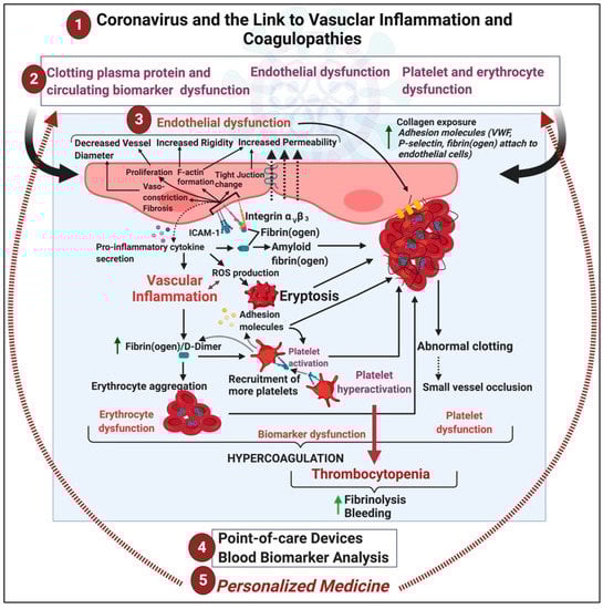 (1) Vascular implications of acute respiratory syndrome coronavirus 2 (COVID-19) (2) may result in clotting protein and circulating biomarker, endothelial, and erythrocyte and platelet dysfunctions. (3) We review the various biochemical processes associated with vascular dysfunction, focussing on fibrin(ogen), D-dimer, P-selectin and von Willebrand Factor. (4) We conclude by looking at point-of-care devices and methodologies in COVID-19 treatment and suggest that each patient should be treated using a (5) personalized medicine approach. This image was created with BioRender (https://biorender.com/).