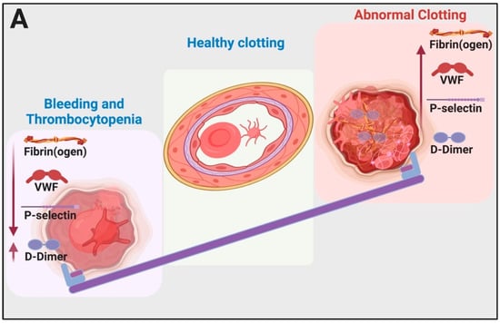 It is very well known that pathological levels (both decreased and increased levels) of fibrin(ogen), D-dimer, VWF and P-selectin play crucial roles in abnormal coagulation and endothelial dysfunction. These molecules may also be significantly dysregulated in patients with COVID-19, as reviewed in the introduction. Specifically, dysregulation during COVID-19 has been noted in P-selectin [], fibrinogen and D-dimers [,,,,,,,,], and VWF [,]. Depending on the direction, dysregulation of fibrin(ogen) D-dimer, VWF and P-selectin may result in either hypercoagulation or excessive bleeding and thrombocytopenia. During typical bleeding and abnormal clotting diseases, low fibrinogen levels are indicative of a higher propensity for bleeding while high levels are known to be associated with hypercoagulation []. We summarized these phenomena in Figure 2A. Bleeding as well as thrombotic events often occur in subjects with multiple weak risk factors which interact to produce the symptoms []. Both bleeding, thrombocytopenia and thrombotic pathologies have been reported in COVID-19 patients and are significant accompaniments to acute respiratory distress syndrome and lung complications [,,,,,,]. Therefore, fibrin(ogen) levels, D-dimer, VWF and P-selectin could all be valuable biomarkers that might provide clinicians with the correct clinical diagnosis and might assist in deciding the method of treatment.