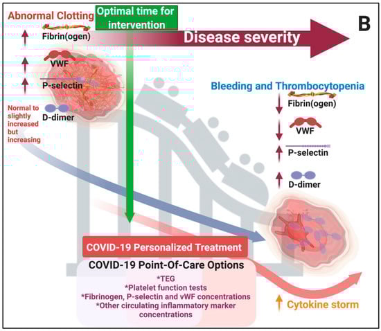 Our understanding of this process is explained in Figure 2B, and clinical observation suggests the following: during early-stage COVID-19, in patients presenting with normal to slightly increased D-dimer levels, increased levels of fibrinogen, VWF and P-selectin and slightly activated platelets, if untreated, the clinical picture changes to a rapid increase in D-dimer; still higher levels of fibrinogen, VWF and P-selectin; and hyperactivation of platelets. This is in line with hyperclotting or thrombosis. In the critically ill patients, D-dimer and P-selectin levels are high while fibrinogen and VWF levels are decreased as these molecules are depleted from either circulation or the damaged endothelial cells and hyperactivated platelets that now show thrombocytopenia. During these late stages of the progression of the disease, the cytokine storm is also prevalent.