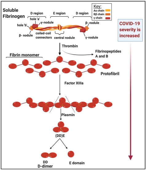 Figure 3 shows the structure of soluble fibrinogen and how it polymerizes into insoluble fibrin fibre (blood) clots under the action of thrombin. Fibrinogen is a large, extracellular protein, synthesised by the liver and mainly found in the blood [,,]. Fibrinogen is also an acute-phase protein that is upregulated during inflammation [,,]. Upregulation of fibrin(ogen) is associated with hypercoagulability and endothelial dysfunction. Increased fibrinogen levels are also associated with many inflammatory conditions including hypertension, diabetes and thrombotic strokes [,,,,]. Blood clots are dissolved by plasmin, a protein which degrades fibrin networks, producing fibrin degradation products [], which include D-dimer []. D-dimer is also an important circulating inflammatory biomarker [,,,,]. The D-dimer protein contains two cross-linked D fragments from the fibrinogen protein formed upon degradation of the fibrin gel, the core component of blood clots []. Fragment D consists of all three (α-, β- and γ-) chains that are components of intact fibrinogen [].