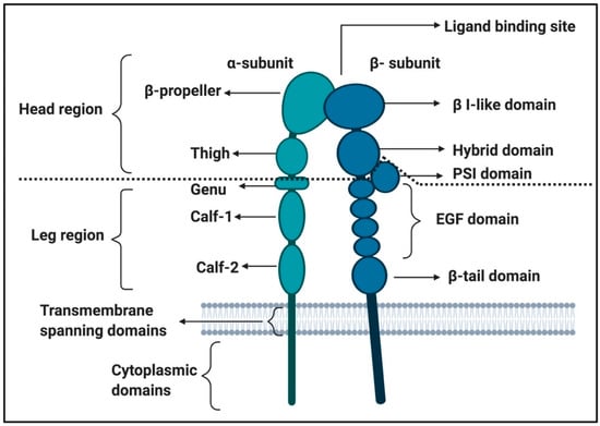 Soluble fibrinogen mainly binds to integrins on platelets, activating the platelets and promoting the formation of a platelet clot [,,]. Integrins are cell-surface transmembrane receptors responsible for platelet aggregation and adhesion of cells to vessel walls [,,]. Integrin αIIbβ3 signalling is one of the important platelet processes where fibrinogen binding is involved [] and is involved in platelet spreading [] (see Figure 4 for the integrin αIIbβ3 structure). Other integrins to which fibrinogen binds have also been identified, not only on platelets but also on endothelial cells; see Table 1 for such receptors.