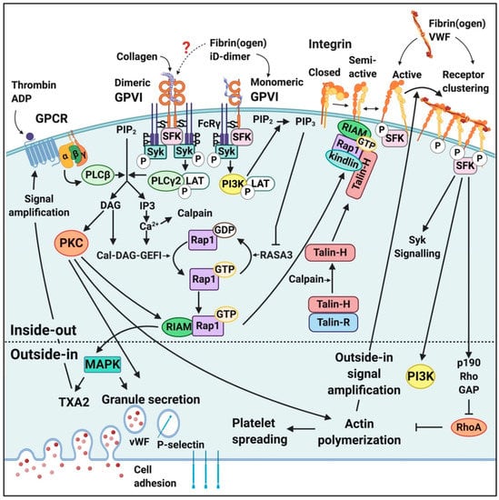 Activation of a platelet, inside-out and outside-in signalling upon ligation of major platelet membrane receptors. Adapted from [,,,,]. Abbreviations: GPCR, G-protein coupled receptor; GPVI, glycoprotein VI; VWF, von Willebrand’s factor; PIP2, phosphatidylinositol 4,5-bisphosphate; PIP3, phosphatidylinositol (3,4,5)-trisphosphate; SFK, Scr family kinases; Syk, spleen tyrosine kinase; PLC, phospholipase C; LAT, linker for activation of T-cells; DAG, diacylglycerol; IP3, inositol triphosphate; PKC, protein kinase C; Ca2+, calcium ions; Cal-DAG-GEFI, diacylglycerol regulated guanine nucleotide exchange factor I; GDP, guanine diphosphate; GTP; guanine triphosphate; RASA3, Ras GTPase-activating protein 3; RIAM, Rap1-GTP interacting adapter molecule; MAPK, mitogen-activated protein kinase; TXA2, thromboxane A2; GAP, GTPase activating protein; PI3K, phosphatidylinositide 3-kinase. This image was made using BioRender (https://biorender.com/).