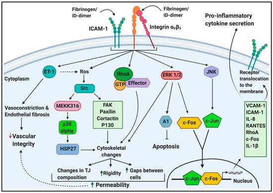 During inflammation, fibrin(ogen) contributes to the transmigration of leukocytes from blood vessels to inflamed tissues. This is achieved by simultaneously binding to ICAM-1 and integrin αMβ2 on ECs and leukocytes []. However, during hyperfibrinogenaemia, fibrinogen contributes to endothelial dysfunction, proliferation and angiogenesis [,,,,,,,]. Endothelial dysfunction also increases the risk of thrombus formation [,,,,,,,,,,,,,,,,,,,,,,,,,,,,,,,,,,,,,,,,,,,,,,,,,,,,,,,,,,,,,,,,,,,]. Vasoconstriction was also shown to be mediated by fibrinogen and fragment D (early degradation product of fibrin(ogen)), when they bind to vascular ICAM-1 []. This might suggest that iD-dimer, too, may bind to ICAM-1 and that it is, in part, responsible for increased vascular tone and resistance, which compromises blood circulation. Figure 6 depicts some of the main intracellular pathways elicited upon fibrinogen (and possibly iD-dimer) binding to their receptors on endothelial cells.