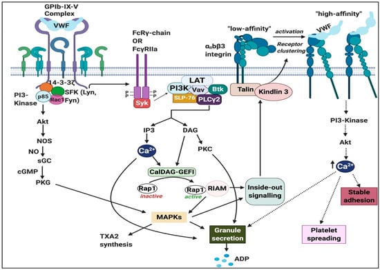 Engagement of GPIb-IX-V activates intracellular signalling events that lead to full platelet activation and aggregation through the αIIbβ3 integrin []. The binding of VWF to GPIb-IX-V leads to the upregulation of αIIbβ3 integrin affinity []. VWF can then bind to αIIbβ3, thus enhancing platelet adhesion and platelet aggregation and contributing to thrombus formation by binding to fibrinogen [], which is mediated via different pathways. Intracellular signalling that induces changes in the extracellular ligand-binding domain of integrins from a low-affinity state to the activated or high-affinity resulting inside-out signalling []. Figure 7 shows some of the signalling pathways of VWF.