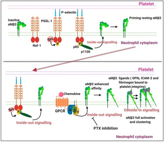 The signalling pathways involved in neutrophil and platelet activation: Adapted from []. Abbreviations: GPCR: G protein-coupled receptor; Mac-1 or (αMβ2), macrophage antigen-1; P-sel, P-selectin; PSGL-1, P-selectin glycoprotein ligand-1; PTX, pertussis toxin. Figure created using BioRender (https://biorender.com/).
