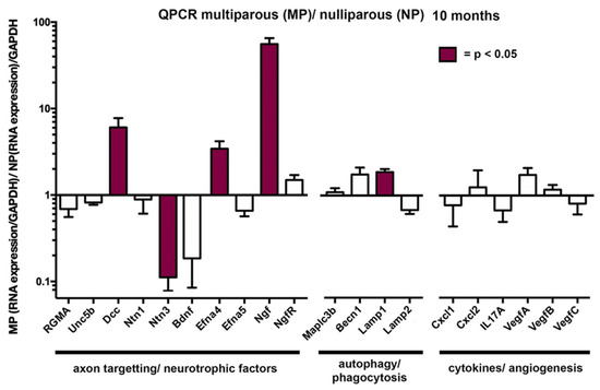 Parity leads to elevated expression of corneal epithelial mRNAs for Ngf, Dcc, Efna4, and Lamp1 and reduction expression of Ntn3 in female mice at 10M. RNA was isolated from the epithelium of 10M NP and MP mice and used for qPCR studies to look at expression of 20 RNAs involved in maintaining the corneal sensory nerves. Data for NP and MP RNA are normalized by GAPDH and presented as a ratio of MP/NP. Values above 1 indicate increased expression in MP and values less than 1 indicate reduced expression. Data that are significant are shown in maroon.