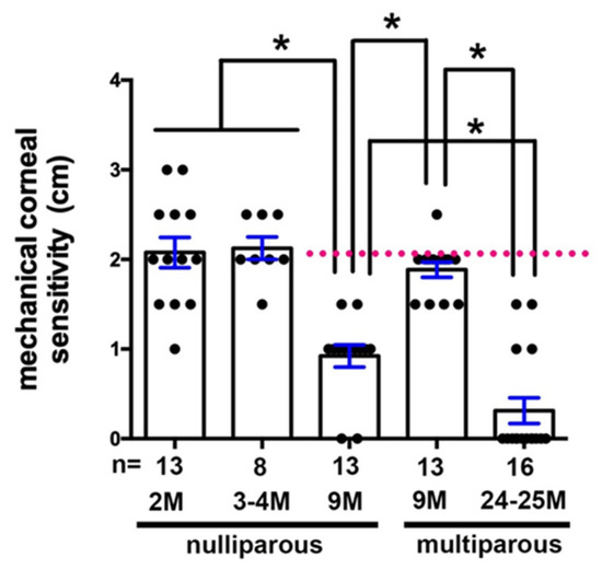 Parity attenuates age-related loss of cornea sensitivity in 9M but not 24M old female mice. Corneal sensitivity was assessed by modified Cochet–Bonnet anesthesiometer in 2M, 3–4M, and 9M NP and 9M and 24–25M MP mice. MP mice retain corneal sensitivity at 9M, whereas NP mice have significantly reduced sensitivity at 9M. Asterisks indicate significant differences with p values < 0.05.