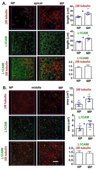In Figure 7, we show representative 3D confocal images taken from the center of the cornea at the vortex from six 9M NP and MP corneas, respectively, whose nerves were visualized using βIII tubulin and L1CAM. Individual confocal images showing the apical aspect of each cornea are presented on the left and from the middle of the cornea are presented on the right. For the apical images, we measure the lengths of the pICNTs using both βIII tubulin and L1CAM; for the middle images, nerve terminals appear as puncta. We measured the sizes of the puncta using both βIII tubulin and L1CAM. Because we have shown data on the ICBNs in Figure 1, we do not present those data again. While βIII tubulin is an intracellular cytoskeletal protein, L1CAM is an integral membrane cell adhesion molecule whose extracellular domain interacts homophilically with L1CAM or heterophilically with integrins on corneal epithelial cells. The epitope recognized by the antibody used for L1CAM is extracellular and the protein is susceptible to cleavage from ICNs by extracellular proteases during wound healing on reinnervating ICNs [21]. We then calculate the ratio of L1CAM/βIII tubulin in the apical and middle regions of the cornea for six corneas each for NP and MP mice.