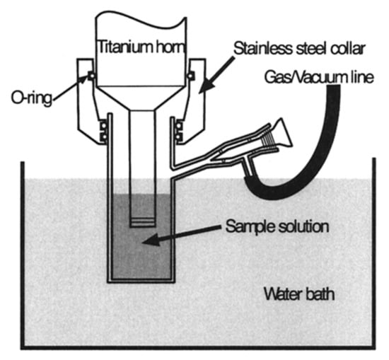 The sonochemical synthesis method is based on ultrasound. In solution, ultrasound can cause high temperature or high pressure. Due to the increased temperature, small metal nanoparticles are created at a rapid reaction rate. Ultrasound induces the collapse or formation of tiny bubbles in a solution that allows the creation of hollow nanoparticles. Further, the production of oxidizing and reducing radicals is crucial for the synthesis of metal nanoparticles [62,63,64,65]. Figure 2 showed brief schematics of the sonication reactor. Sonochemical synthesis has been in use for more than twenty years to synthesize bimetallic alloy nanoparticles such as Au–Pd nanoparticles [66] and has been recently combined with other techniques for the creation of alloy nanoparticles [67,68]. Various alloy nanoparticles such as Au–Pd, Co–Cu, Fe–Pt, Hg–Pd, Au–Ru, Pt–Cu, Fe–Ag–Pt, Pd–Co–Pt have been manufactured by using sonochemical synthesis method [13,66,67,69,70,71,72,73,74,75].