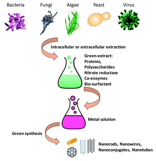 Micro-sized organisms, including bacteria, fungi, yeasts, and even viruses have been considered as nano-factories to produce nanoparticles (Figure 3) because of their ability to accumulate and detoxify heavy metals via various reductase enzymes [149]. The metal reduction can be carried out in the extracellular or intracellular environment. The genes, proteins, enzymes, and biomolecules of the microorganisms play roles as reducing factors. Bacteria such as Escherichia coli, Salmonella typhimurium, Listeria monocytogenes, Bacillus subtilis, and Rhodopseudomonas capsulata [150,151,152,153,154,155,156,157] have been used to create Au–Pd, Pd–Pt, Pd–Ag, Au–Ag, Pd–Fe, Au–Fe, Pd–Au–Fe, and Cu–Ag alloy nanoparticles.