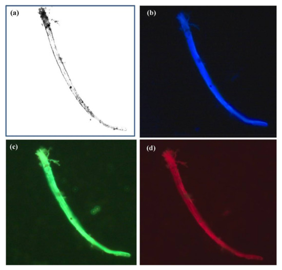 Fluorescence microscopic images of fungal cells (Alternaria sp.) treated with chicken egg white-L-Cysteine-encapsulated Zn-undoped Ag nanoclusters. Image (a) without chicken egg white-L-Cysteine-encapsulated Zn-doped Ag nanoclusters and images with chicken egg white-L-Cysteine-encapsulated Zn-undoped Ag nanoclusters upon the laser excitation at (b) 405 nm (blue), (c) 488 nm (green), and (d) 561 nm (red), respectively. The concentration of chicken egg white-L-Cys-encapsulated Zn-undoped Ag nanoclusters was 0.5 μg/mL [221].