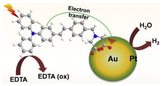 Schematic representation of electron transfer from a triphenylamine derivative, 2,2′-(4-(4-(diphenylamino) styryl) benzylazanediyl) diacetic acid (TPAD) sensitizer into an Au core–Pt shell nanoparticle and photoinduced hydrogen evolution under light irradiation [248].