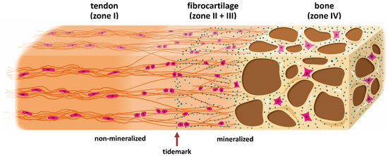 Tendon-bone transitions occur in two forms in the body—fibrous and fibrocartilaginous [2,3]. In fibrous entheses the dense collagen fibers of the tendon directly enter the bone. Fibrous entheses are present in tendons and ligaments which attach to the metaphyses or diaphyses of long bones [4]. In contrast, fibrocartilaginous entheses as they are present in epiphyses and apophyses [4] represent a complex gradient of unmineralized to mineralized tissues which are conventionally divided into four zones [5,6]. Figure 1 provides a schematic illustration of a fibrocartilaginous enthesis. The first zone (region I in Figure 1) is the tendon (or ligament in case of bone-to-bone junctions) which consists of fibroblast-like cells, called tenocytes. Highly aligned collagen type I fibers are interspersed in a non-collagenous extracellular matrix consisting of proteoglycans and glycoproteins as major components [7]. The following zone (II) is made up of uncalcified fibrocartilage with fibrochondrocytes in a network-like organized collagen type II and III fibers as well as proteoglycan aggrecan as major constituents. The third zone (III) is calcified fibrocartilage with collagen type II and X stiffened by mineral deposits and aggrecan. The transition area ends in bone as fourth zone (IV) and consists of osteoblasts, osteocytes and osteoclasts in a matrix of mineralized collagen type I [8,9,10,11]. The bone at these sites is thin and porous. Blood vessels enter this region from the adjacent bone marrow and thereby provide nutrition to the entheses and allow the removal of metabolic products [12]. In contrast to this, the fibrocartilage area is an avascular zone which decreases the transmission of inflammation and infection from vascularized bone to less vascularized tendon [6].