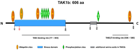 Subcellularly, TAK1 is mainly localized in the cytoplasm while also being able to translocate into the cell nucleus or associate with the plasma membrane. A constitutive nuclear localization of TAK1 has been reported in neutrophils for example [91]. The protein is transcribed in two major isoforms—TAK1a with 579 amino acids and TAK1b with 606 amino acids. The longer variant has 27 additional amino acids; otherwise the peptide sequences of both isoforms are identical, see Figure 2. For more information on the splice variants and their cell and tissue distribution, the reader is referred to publications by colleagues [92,93,94].