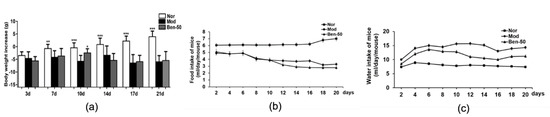 2.2. The Time-Feature on Bodyweight, Water Intake and Food Intake in Hyperuricemia Mice Induced by PO and Adenine