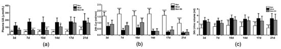 | 3 days | 0.395 ± 0.071 ** | 0.672 ± 0.085 | 0.193 ± 0.017 *** | 0.517 ± 0.055 | 1.034 ± 0.045 * | 0.837 ± 0.065 |
