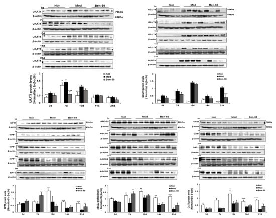 2.5. The Time-Feature on the Expression of Urate Transporters Protein in Hyperuricemia Mice Induced by PO and Adenine