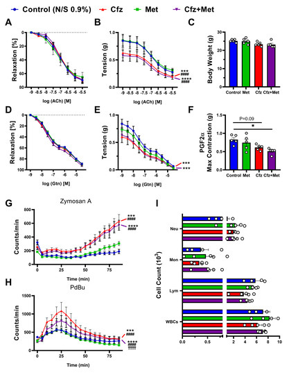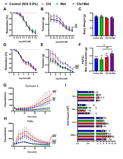 2.1. Carfilzomib Led to an Acute Decrease in PGF2α-Induced Aortic Constriction and Leucocyte-Derived Oxidative Burst, Independently of Metformin Cotreatment