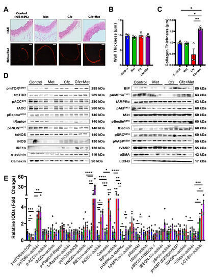 We assessed the histological vascular phenotype in the subacute protocol in the context of identifying potential permanent vasculature damage regarding altered wall thickness and collagen deposition. Carfilzomib administration alone did not induce changes in the vascular wall thickness as assessed by hematoxylin–eosin (H&E) staining (Figure 3A (upper panel),B), while Cfz+Met cotreatment led to a significant increase in collagen deposition (Figure 3A (lower panel),C). Immunoblotting analysis showed that metformin decreased mammalian target of rapamycin (mTOR) phosphorylation versus control. Carfilzomib caused a decrease in the phosphorylation of mTOR, AMP-activated kinase α (AMPKα) and protein kinase B (Akt) compared to the control and to increased mTOR, inositol-requiring enzyme-1α (IRE1α), inducible nitric oxide synthase (iNOS), calnexin, binding immunoglobulin protein (BIP) and LC3-B expression, an upregulation of endoplasmic reticulum (ER) stress (as shown by the ER stress markers IRE1α, calnexin and BIP) and increased autophagy (as shown by the autophagy marker LC3-B). Interestingly, coadministration of carfilzomib and metformin led to an even greater decrease in mTOR phosphorylation and αSMA expression, as well as an increase of LC3-B and IRE1α expression compared to the control group, demonstrating sustained ER stress and increased autophagy in the aortas. Coadministration of the drugs led to a minor but significant decrease in BIP and calnexin expression, which remained significantly increased compared to the control group, and to a restoration of both AMPKα and Akt phosphorylation, as demonstrated previously by our group in the murine myocardium [11] (Figure 3D,E). Importantly, endothelial markers such as endothelial nitric oxide synthase (eNOS) and vasodilator-stimulated phosphoprotein (VASP) phosphorylation and expression were not affected by treatments administration. The increased LC3-B and decreased αSMA expression was further confirmed by immunofluorescent confocal microscopy (Figure S3). Conclusively, carfilzomib appeared to induce autophagy and ER stress in the aortic vasculature. Carfilzomib and metformin coadministration amplified the autophagic signaling and decreased vascular αSMA expression, with no effect on the endothelial homeostasis.