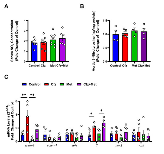 To further investigate the endothelial homeostasis as well as the redox status of the carfilzomib- and metformin-treated mice, the total circulating nitrates/nitrites (NOx) content in the sera as a biomarker of NO release, 3-nitrotyrosine (3-NT), nicotinamide adenine dinucleotide phosphate (NADPH) oxidase 2 (nox2) and NADPH oxidase 4 (nox4) redox-related genes in the aortic tissues as markers of nitro-oxidative stress were assessed [12]. Neither carfilzomib nor metformin or the drugs coadministration led to any significant changes in NOx and 3-NT content (Figure 4A,B), whereas nox2 and nox4 levels did not differ among groups (Figure 4C). Based on these results, endothelial homeostasis was unaffected by carfilzomib and metformin at the selected doses in the subacute protocol and subacute carfilzomib administration did not lead to nitro-oxidative mediated damage of the aortic tissue.