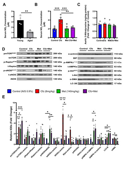 Carfilzomib and metformin coadministration induced LC3-B-dependent autophagy in the aortas of aged mice, while Cfz increased serum NOx content without leading to a nitro-oxidative stress in the aortas. Graphs of serum NOx concentration (μM) of (A) young (3–4 months of age) and aged (15–17 months of age) mice (n = 4 per group). (B) Aged mice treated with carfilzomib (Cfz), metformin (Met) or the combination of the drugs (n = 5 per group). (C) Graph of aortic 3-nitrotyrosine (3-NT; ng/mg protein; fold change of the control) of aged treated mice (n = 5 per group). (D) Representative Western blot images of aged murine aortas and (E) relative densitometry analysis of the selected proteins and their phosphorylated forms (n = 5 per group; * p < 0.05, ** p < 0.01, *** p < 0.005, one way ANOVA, Tukey’s multiple comparison test). Data are presented as mean ± SEM and individual values are presented as scatter column graphs. Blue lines/columns represent the control (Normal Saline; NS 0.9%), red lines/columns represent Cfz (8 mg/kg, ip), green lines/columns Met (140 mg/kg, per os) and purple lines/columns Cfz+Met (8 mg/kg, ip and 140 mg/kg, per os, respectively) in the 6 days protocol (subacute protocol). Cfz, Carfilzomib; Met, Metformin.