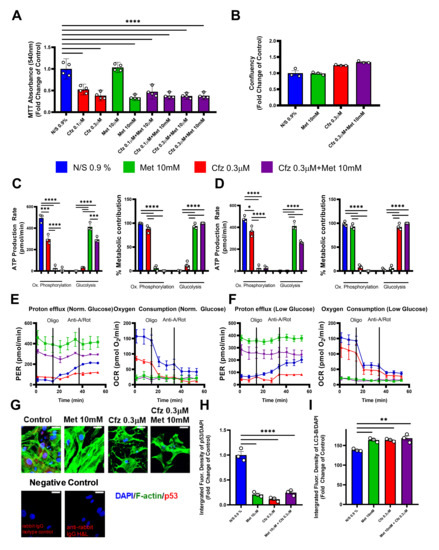 Carfilzomib and metformin induce cytotoxicity in primary murine vascular smooth muscle cells (prmVSMCs) in vitro. Graphs of (A) MTT absorbance (540 nm) expressed as the fold change of the control (**** p < 0.001; one way ANOVA, Tukey’s multiple comparison test; n = 4 per group), (B) cellular confluency expressed as the fold change of the control (n = 3 per group), (C) ATP production rate (pmol/min) and % metabolic contribution under conditions of normal glucose (10 mM) originating from oxidative phosphorylation and glycolysis (*** p < 0.005, **** p < 0.001; one way ANOVA, Tukey’s multiple comparison test; n = 3 per group) and (D) ATP production rate (pmol/min) and % metabolic contribution under conditions of low glucose (1 mM) originating from oxidative phosphorylation and glycolysis (* p < 0.05, **** p < 0.001; one way ANOVA, Tukey’s multiple comparison test; n = 3 per group). Time-course graphs of the proton efflux rate (PER) and oxygen consumption rate (OCR) under the conditions of (E) normal glucose (10 mM) and (F) low glucose (1 mM), as studied with ATPase inhibitor oligomycin (Oligo) and cytochrome c reductase inhibitor antimycin-a (Anti-A) and complex I inhibitor rotenone (Rot). (G) Merged immunofluorescence confocal images of prmVSMCs stained against F-actin (Phalloidin, green), p53 (red) and DAPI (blue) as well as the negative control for the staining (rabbit isotype control and anti-rabbit IgG H&L secondary antibody). Graphs of (H) integrated fluorescence density of p53/DAPI expressed as the fold change of Normal Saline (NS) 0.9%, serving as the control vehicle and (I) total fluorescence intensity of LC3B/DAPI as measured in the automated microscope per well (mean total fluorescence intensity of individual VSMCs in the well; ** p < 0.01, **** p < 0.001; one way ANOVA, Tukey’s multiple comparison test; n = 3 per group). Data are presented as mean ± SEM and individual values are presented as scatter column graphs. Blue lines/columns represent Normal Saline (NS) 0.9%, red lines/columns represent Cfz (0.3 μΜ), green lines/columns Met (10 mM) and purple lines/columns Cfz+Met (0.3 μΜ, 10 mM respectively). Cfz, carfilzomib; Met, metformin; prmVSMCs, primary murine vascular smooth muscle cells.