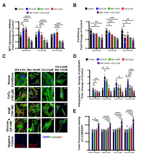 To simulate clinical observations in vitro, we subjected the senescent HAoSMCs to cardiovascular risk stimuli, such as angiotensin II (AngII)-simulating hypertension, CoCl2-simulating hypoxia and high glucose-simulating hyperglycemia. AngII and CoCl2 led to an increased MTT metabolic conversion, as demonstrated previously by other groups (Figure 8A) [16,17,18]. In agreement with findings in the untreated senescent cells, metformin and Cfz+Met led to significant cytotoxicity (Figure 8A) in the context of all comorbidity stimuli. Concerning cellular confluency, carfilzomib and Cfz+Met showed a compliant decrease in all tested settings (Figure 8B). Finally, to investigate whether the effect was apoptosis- or autophagy-mediated we performed immunofluorescent experiments of p53 and LC3-B expression. Confirming earlier reports [15,19,20,21,22,23,24], AngII (100 nM) and glucose (25 mM) led to an increase of p53 expression in HAoSMCs. In compliance with the prmVSMCs, all treatments led to a decrease in p53 expression in the absence of cardiovascular risk stimuli (Figure 8C,D), an effect that was consistent among all comorbidity settings and significant in the high glucose cohort compared to Normal Saline (NS) 0.9% (Figure 8C,D). On the contrary, in all tested conditions, a significant increase in LC3-B expression was observed only in the Cfz+Met group (Figure 8E).