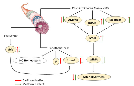 Schematic representation of the effect of carfilzomib and metformin coadministration on the vessels. White panels represent independent molecular targets, red arrows indicate Cfz-dependent pathways, green arrows represent Met-dependent pathways. Cfz, carfilzomib; Met, metformin.
