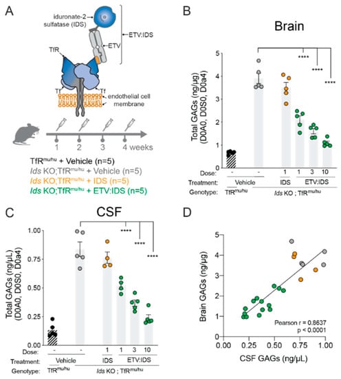 Correlation between brain and CSF GAGs in Ids KO;TfRmu/huKI mice. GAG levels were evaluated in the brain and CSF of Ids KO;TfRmu/huKI mice following treatment with increasing doses of ETV:IDS. TfRmu/hu KI mice served as non-disease controls; (A) ETV:IDS is the lysosomal enzyme (E) iduronate 2-sulfatase (IDS) fused to the Transport Vehicle (TV), a TfR-binding Fc domain. Ids KO;TfRmu/huKI were treated with 4-weekly intravenous doses of vehicle, ETV:IDS or IDS alone. Brain (B) and CSF (C) were harvested 7 days following the last dose and GAGs were measured using LC-MS/MS; (D) correlation between brain and CSF GAG levels of Ids KO;TfRmu/huKI treated with ETV:IDS or IDS. Pearson r was used to determine the correlation coefficient. Graphs display mean ± SEM and p values: one-way ANOVA with Dunnett multiple-comparison test; **** p < 0.0001; n = 5 per group.