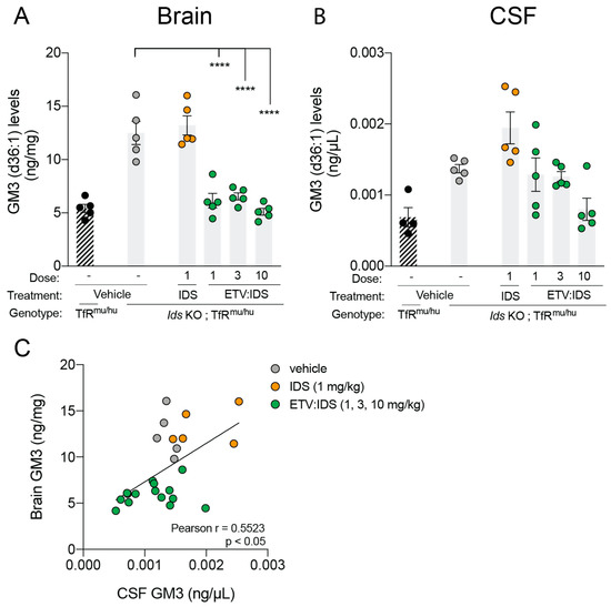 We next sought to understand the relationship between GAGs, the primary storage substrate accumulated in MPS II, and markers of secondary lysosomal dysfunction, such as gangliosides, which are ubiquitous glycosphingolipids that typically accumulate in dysfunctional lysosomes. Previous studies have shown an accumulation of lysosomal lipids in brain and CSF of Ids KO;TfRmu/huKI and a correction of this lipid accumulation following ETV:IDS treatment [31]. Therefore, the correction of secondary lysosomal lipid storage represents strong evidence that lysosomal function is normalized. In this study, we evaluated brain and CSF ganglioside levels, in particular GM3, in Ids KO; TfRmu/huKI mice following treatment with increasing doses of ETV:IDS or IDS at 1 mg/kg. We focused on GM3 based on previous reports which showed an increase in GM3 levels, among other lysosomal lipids, in the brains of autopsied MPS II individuals [9], as well as our recently described work in a mouse model of MPS II [31]. Similar to our previous studies, ETV:IDS significantly reduced GM3 levels in brain and CSF, while IDS alone did not (Figure 2A,B). Correlation analysis showed a significant positive correlation between brain and CSF GM3 levels, suggesting that CSF biomarker changes such as GM3 reduction could serve as a surrogate for pharmacodynamic effects in the brain, beyond primary storage products such as GAGs (Figure 2C).