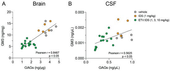 Positive correlation between primary storage substrate (GAGs) and accumulated lysosomal lipids (Ganglioside GM3) in brains and CSF Ids KO;TfRmu/huKI mice. GAGs and Ganglioside GM3 levels were evaluated in brains (A) and CSF (B) of Ids KO; TfRmu/huKI mice treated with increasing doses of ETV:IDS or IDS. The scatter plot was used to determine the correlation between GM3 and GAG levels in brains and CSF. Pearson r was used to determine the correlation coefficient.