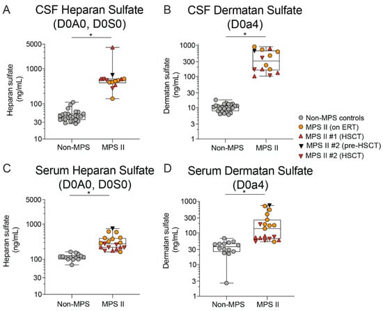 Since HS is considered to be the primary driver of downstream pathophysiology in MPS (reviewed in Reference [34]), we evaluated HS and DS levels separately using an analytically qualified LC-MS/MS assay described in Wang et al. IJMS co-submission (Figure S1), as opposed to previously published total CSF GAG methods [29]. HS and DS levels were quantified in CSF and serum by measuring the most abundant HS derived disaccharides, D0A0 and D0S0, and DS derived disaccharide, D0a4 [35,36].