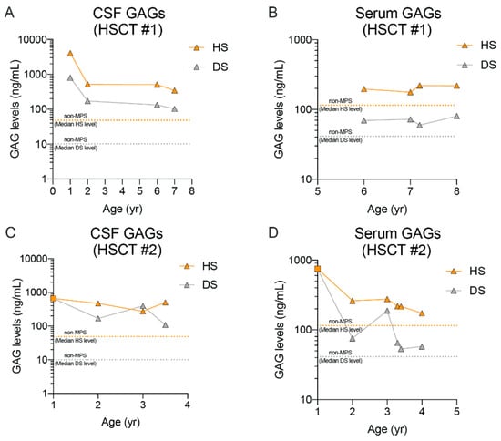 Longitudinal HS and DS levels in CSF and serum of nMPS II patients with HSCT. CSF and serum HS and DS measured by LC-MS/MS and quantified against calibration curves generated using pure reference standards for D0A0, D0S0, and D0a4. HS (orange; sum of D0A0 and D0S0) and DS (gray; D0a4) are plotted again age to show time-dependent changes in GAGs post HSCT. For HSCT patient #1 (A,B), only post-transplant samples were available, with the earliest collection at age 1. For HSCT patient # 2 (C,D), the sample collected at age 1 is a pre-HSCT sample (closed squares). Median HS and DS values for the non-MPS control group are shown for reference. Refer to Figure 4 for individual data points for control groups.