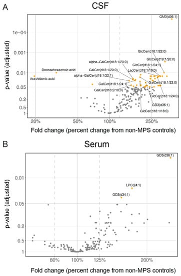 Exploratory lipidomic analysis in CSF and serum shows an accumulation of lysosomal lipids in the CSF of nMPS II patients relative to non-MPS controls. A volcano plot of lipid species in (A) CSF and (B) serum is shown. Changes in MPS II are depicted as % of non-MPS controls. Values above 100% imply an increase, while values below 100% imply a decrease from non-MPS controls. Differences between nMPS II and non-MPS controls are estimated using a linear mixed-effects model to account for subjects with repeated measures (2 MPS II patients on HSCT). Due to the exploratory nature of the analysis, age was adjusted as a linear effect across all analytes. The treatment effect was not considered due to the small number of patients with HSCT. P values are adjusted for multiple comparisons across all measurable analytes using the Benjamin-Hochberg methodology.