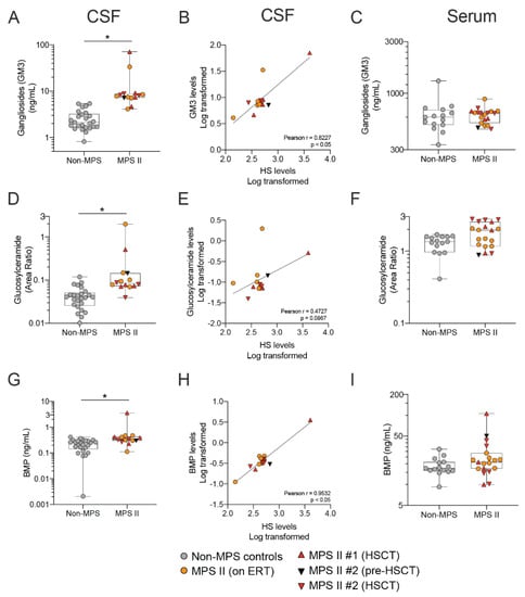 Elevated lysosomal lipid levels correlate with heparan sulfate levels in CSF of nMPS II patients. Lysosomal lipids such as Gangliosides GM3(d36:1) (A–C), Glucosylceramides (d18:0/20:0) (D–F), and BMP (18:1/18:1) (G–I) are quantified in CSF and serum of nMPS II patients and non-MPS controls using LC-MS/MS; (A,B,D,E,G,H) CSF lysosomal lipid levels in nMPS II patients that were either untreated at the time of sample collection (n = 1), on enzyme replacement therapy (n = 6), or on HSCT (n = 2) were compared to age-matched controls (n = 25); (C,F,I) serum lysosomal lipid levels in nMPS II patients that were either untreated at the time of sample collection (n = 1), on ERT (n = 9), or on HSCT (n = 2) were compared to age-matched controls (n = 15). Each data point represents a single control or patient visit. Data are plotted using a min to max box plot. Differences between nMPS II and non-MPS controls are estimated using a linear mixed-effects model to account for repeated measures in 2 patients. No evidence of age or treatment is seen in the nMPS II sample set, and thus the model will not specifically adjust for these in the estimation; * p < 0.05.