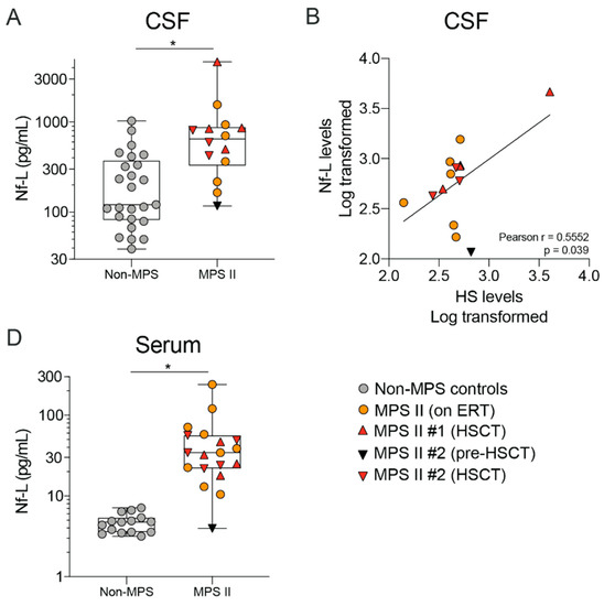 We sought to determine whether we could detect alterations in a marker of neuronal degeneration neurofilament light chain (Nf-L), in this nMPS II patient population. As mentioned above, there is significant neurodegeneration in nMPS II patients, as observed via TUNEL staining of post-mortem brain tissue or MRI methods in living patients [17,18,19]. However, no fluid-based biomarker for monitoring neurodegeneration in nMPS II patients has been reported. We measured levels of Nf-L in the CSF and serum and found a significant elevation in Nf-L in both the CSF and serum of nMPS II patients regardless of their treatment regimen (Figure 8A,C), and that Nf-L levels positively correlated with CSF HS (Figure 8B). This is the first report to our knowledge that has documented an elevated neuronal injury marker in biofluids from nMPS II patients.