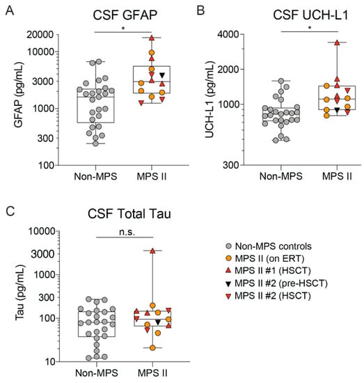 Neurodegeneration markers GFAP and UCH-L1 are elevated in nMPS II CSF. (A) GFAP, (B) UCLH-L1, and (C) total-Tau were quantified using SIMOA detection. nMPS II patients who were either untreated at the time of sample collection (n = 1), on enzyme replacement therapy (n = 6), or on HSCT (n = 2) were compared to age-matched controls (n = 25). Each data point represents a single control or patient visit. Data are plotted using a min to max box plot. Differences between nMPS II and non-MPS controls are estimated using a linear-mixed effects model to account for repeated measures in 2 patients. No evidence of age or treatment is seen in the MPS II sample set, and thus the model will not specifically adjust for these in the estimation; n.s.- not significant; * p < 0.05.