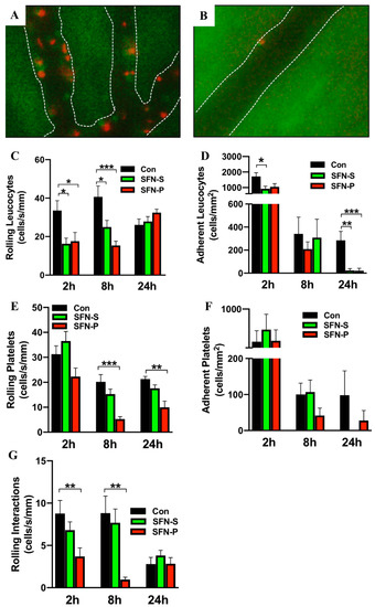 Since SFN had the most prominent effect on leucocyte and platelet rolling, it was lastly examined whether SFN would also effect rolling interactions. It was found that rolling leukocyte-platelet aggregate formation was significantly decreased in mice transplanted with SFN-treated platelets after 2 h and 8 h reperfusion (Figure 2G). In addition, the same trend was noted for systemically SFN treated animals, while this did not reach statistical significance.