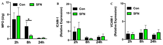 Intestinal neutrophil infiltration measured by MPO activity (A) and expression of ICAM-1 (B) and VCAM-1 (C) determined by qPCR and presented as relative gene expression. All assays were conducted in tissue samples (ileum) of control (CON) and SFN-treated (SFN) animals with 2 h, 8 h and 24 h of reperfusion. All data are presented as mean values ± SEM, n = 8–10 animals per group. Significance is indicated by the following symbol: * = p < 0.05 versus Con.