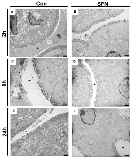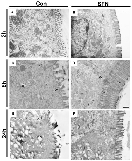 Since it was hypothesized that SFN would reduce immune-mediated enterocyte destruction and thus subsequently preserve the epithelial lining in the small bowel following IRI, a special focus was the evaluation of epithelial morphology and function. First, transmission electron microscopy was used to evaluate IRI-elicited ultrastructural damage. General evaluation (i.e., general condition of the epithelium) and evaluation focusing on mitochondria and cytoplasm presented rising lesion amongst the whole period of 24 h reperfusion (Figure 4A,C,E), whereas evaluation based on microvilli and ER showed changes with no obvious trends in groups of both treatments (Figure 4B,D,F). However, a detailed and representative analysis of both groups revealed a SFN-induced amelioration of ultrastructural alterations. After 2 h of reperfusion, epithelial cells in control animals exhibited altered mitochondria and an enlarged endoplasmic reticulum, while SNF treated samples exhibited an intact morphology and organization of epithelial cells (Figure 5A,B). After 8 h of reperfusion, control animals were characterized by alterations of the brush border with a reduced number and length of the microvilli. One particular finding was that SFN treatment preserved the electron-dense tips of the microvilli, with actin filaments running to the terminal web without SFN treatment. Moreover, the terminal web of the microvilli was disorganized with a more diffuse appearance. In addition, cell-cell contacts between neighboring cells are weaker and more diffuse in control compared to SFN-treated animals. Furthermore, number of vesicles was higher, and the endoplasmic reticulum was more expanded in control samples, whereas number and structural integrity of mitochondria was not obviously altered with or without SFN treatment (Figure 5C,D). After 24 h of reperfusion, epithelial cells of control animals still displayed severe injury evident by alterations of mitochondria, endoplasmic reticulum and brush border, while SFN treated animals showed a clear structural integrity of epithelial cells (Figure 5E,F).