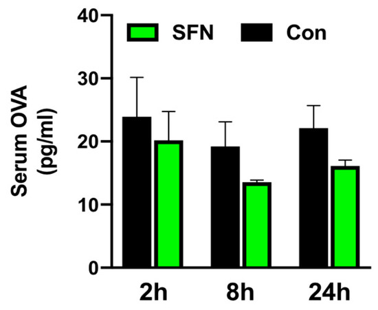 Next, a functional assay was employed to test whether SFN would protect intestinal barrier function and block OVA translocation. Thus, to assess mucosal permeability of the small bowel following IRI, control and SFN treated animals received OVA via gavage one hour before the respective end of reperfusion. Following a peak at 2 h of reperfusion, levels of serum OVA declined over the 24 h course of reperfusion. A trend for a lower serum OVA concentration following SFN treatment was noted at all indicated time-points; however, this did not reach statistical significance (Figure 6).
