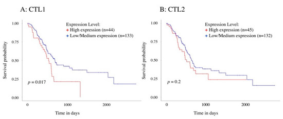 43]. Analysis of the correlation between CTL1 and CTL2 mRNA expression levels and patient survival was analyzed using Kaplan–Meier plots. Patients were classified into either high- or low-/medium-expression groups according to their expression level.